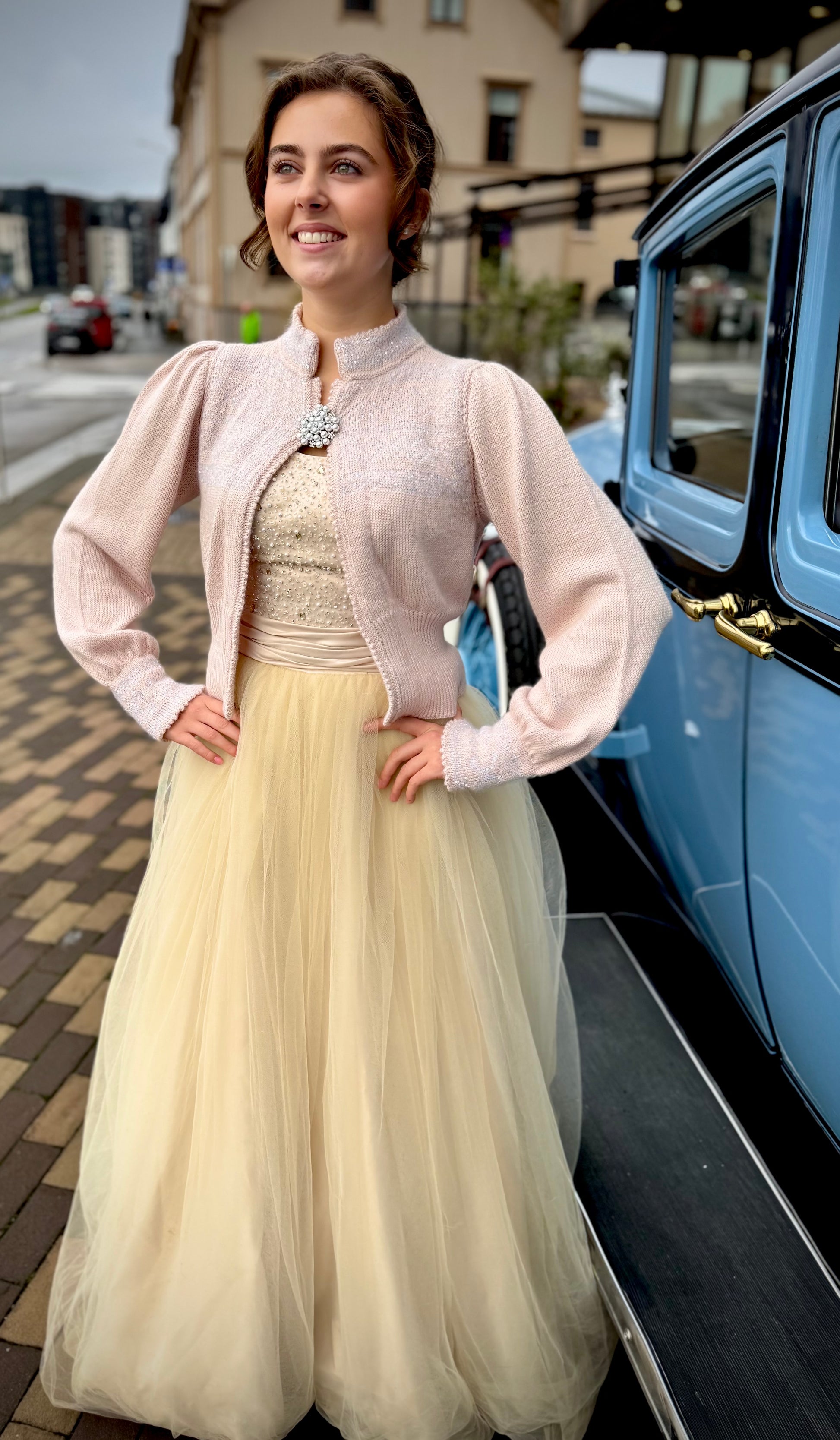 Jakken er ment å være litt åpen foran, slik at brudekjole osv er synlig. Jakken kan lukkes med en nål, spenne o.l.