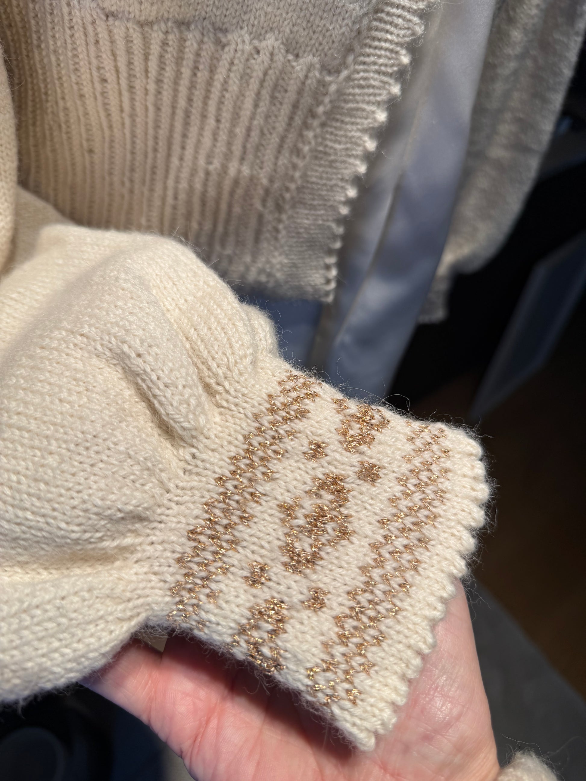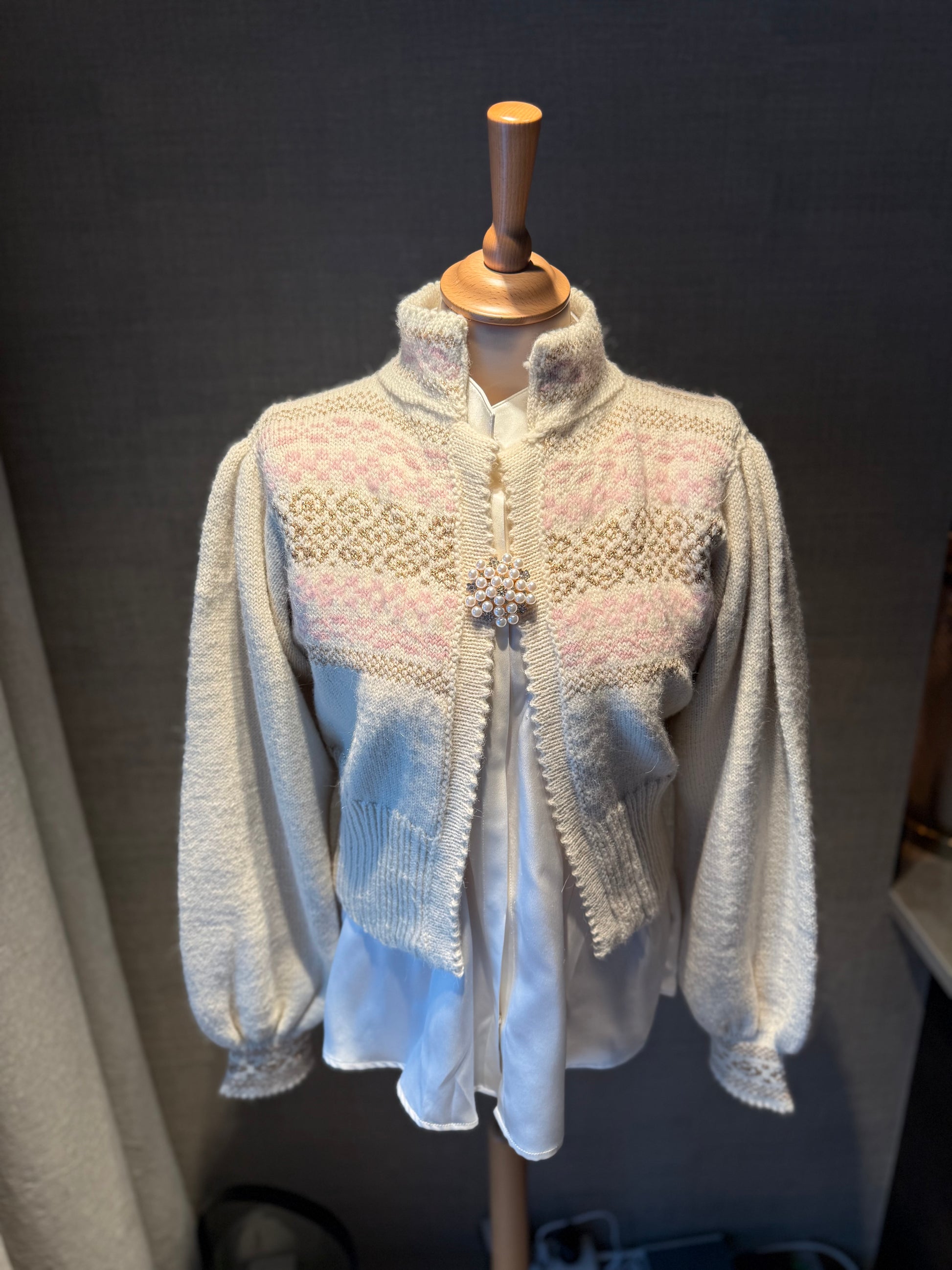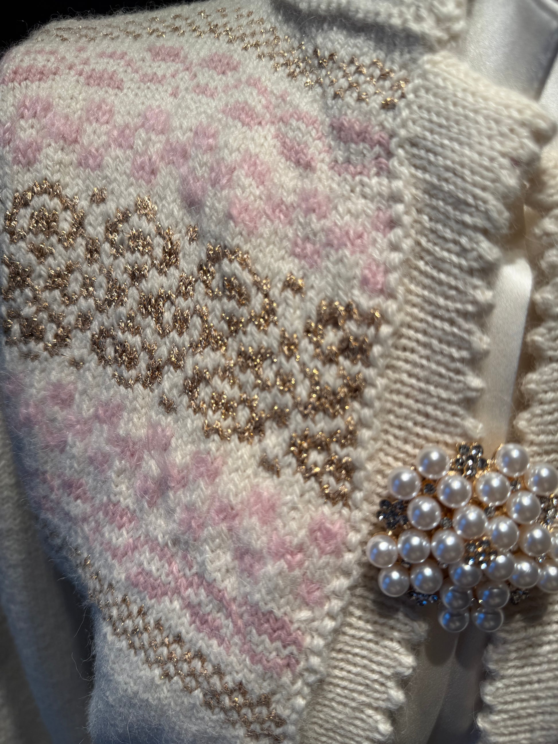 Strikket i Tumi fra Rauma Garn. Myk og god i hvit bunnfarge, lyserosa og gull metallisk garn.