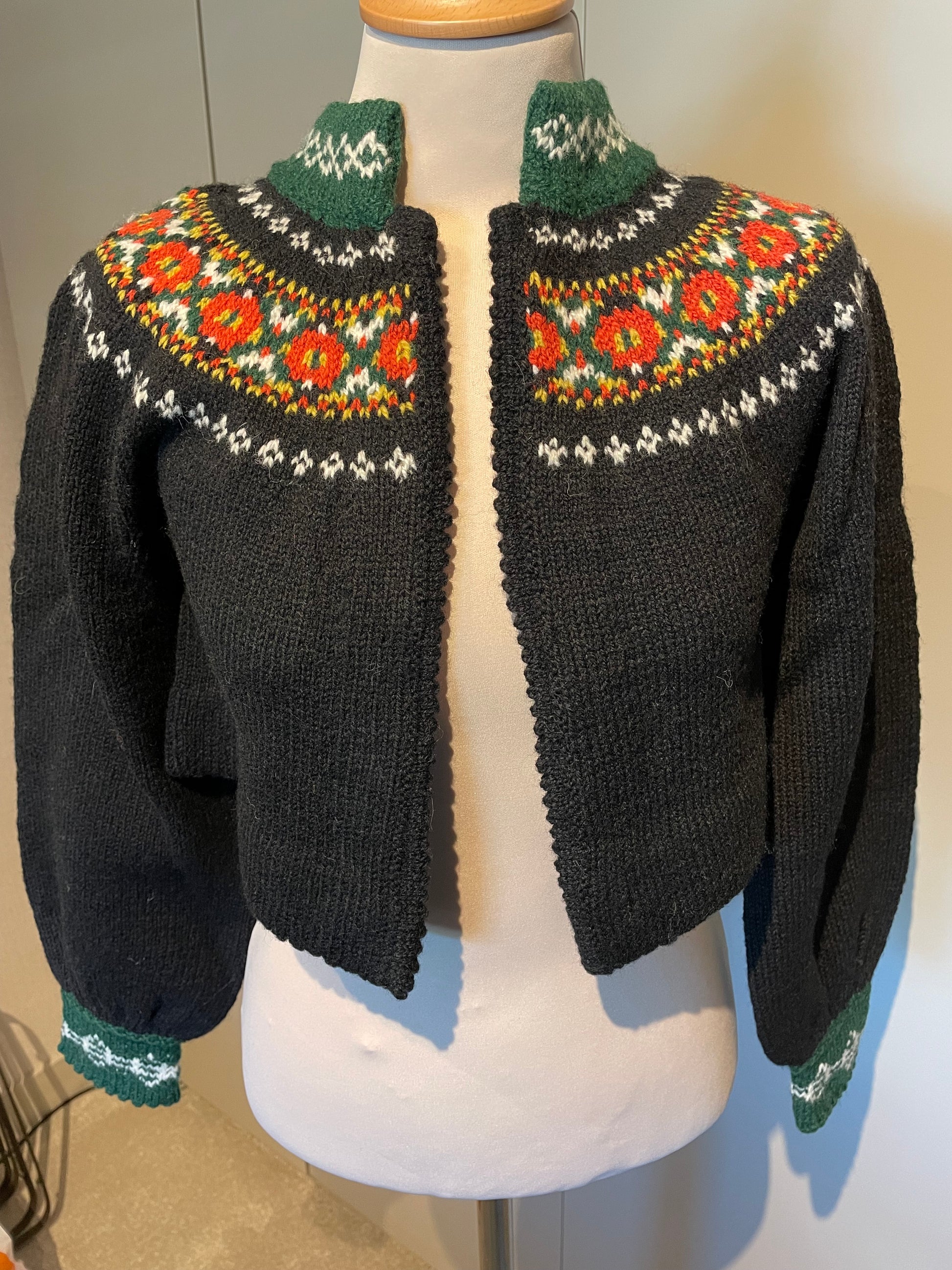 Denne flotte barnejakken er tilpasset Nordfjordbunaden for barn, selges nå til 2000,- + frakt ved forsendelse. Jakken som selges har grønn halskant/mansjetter.