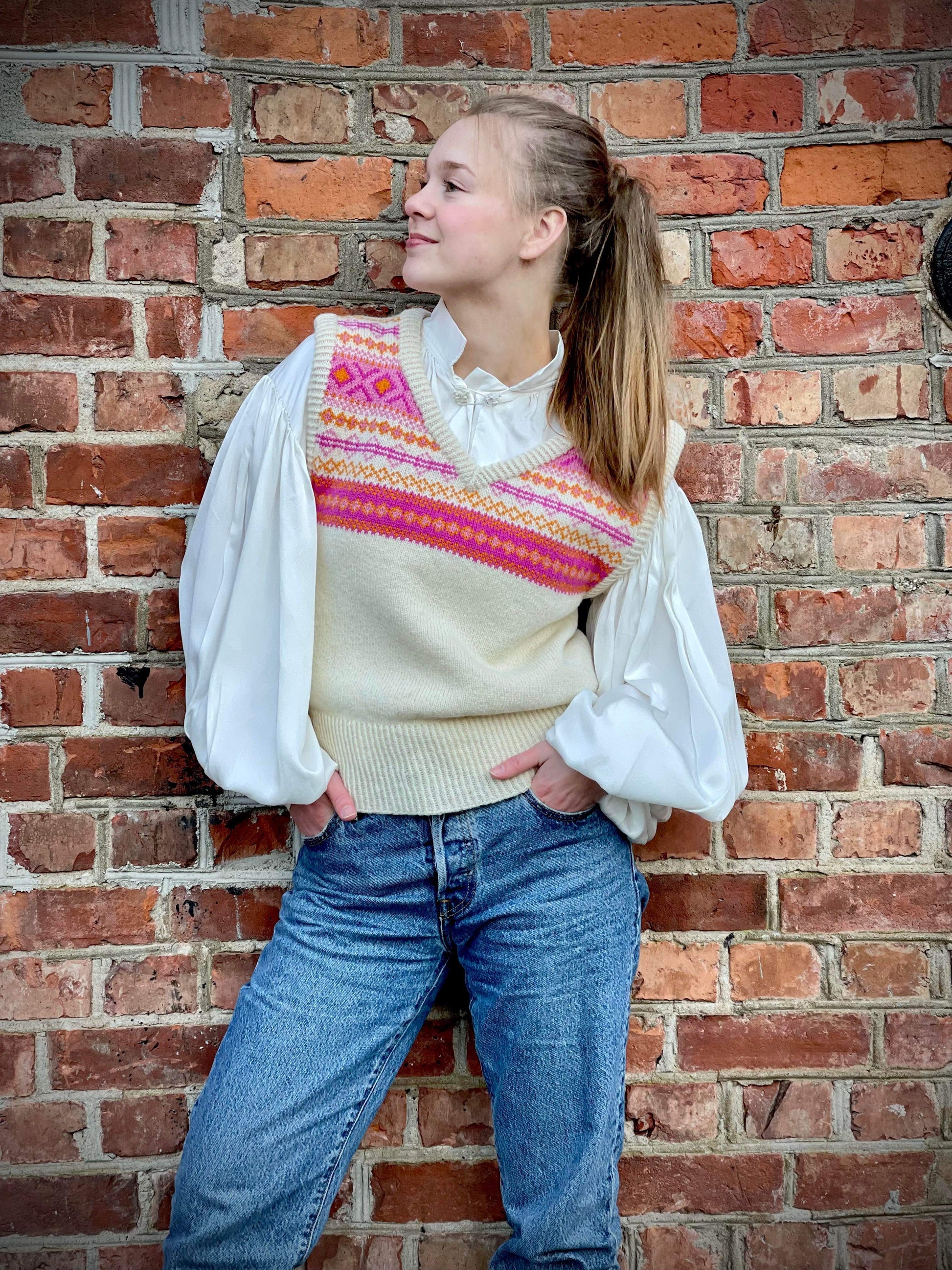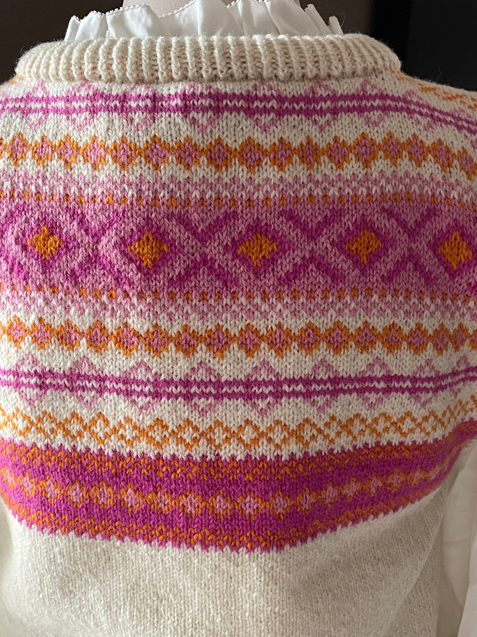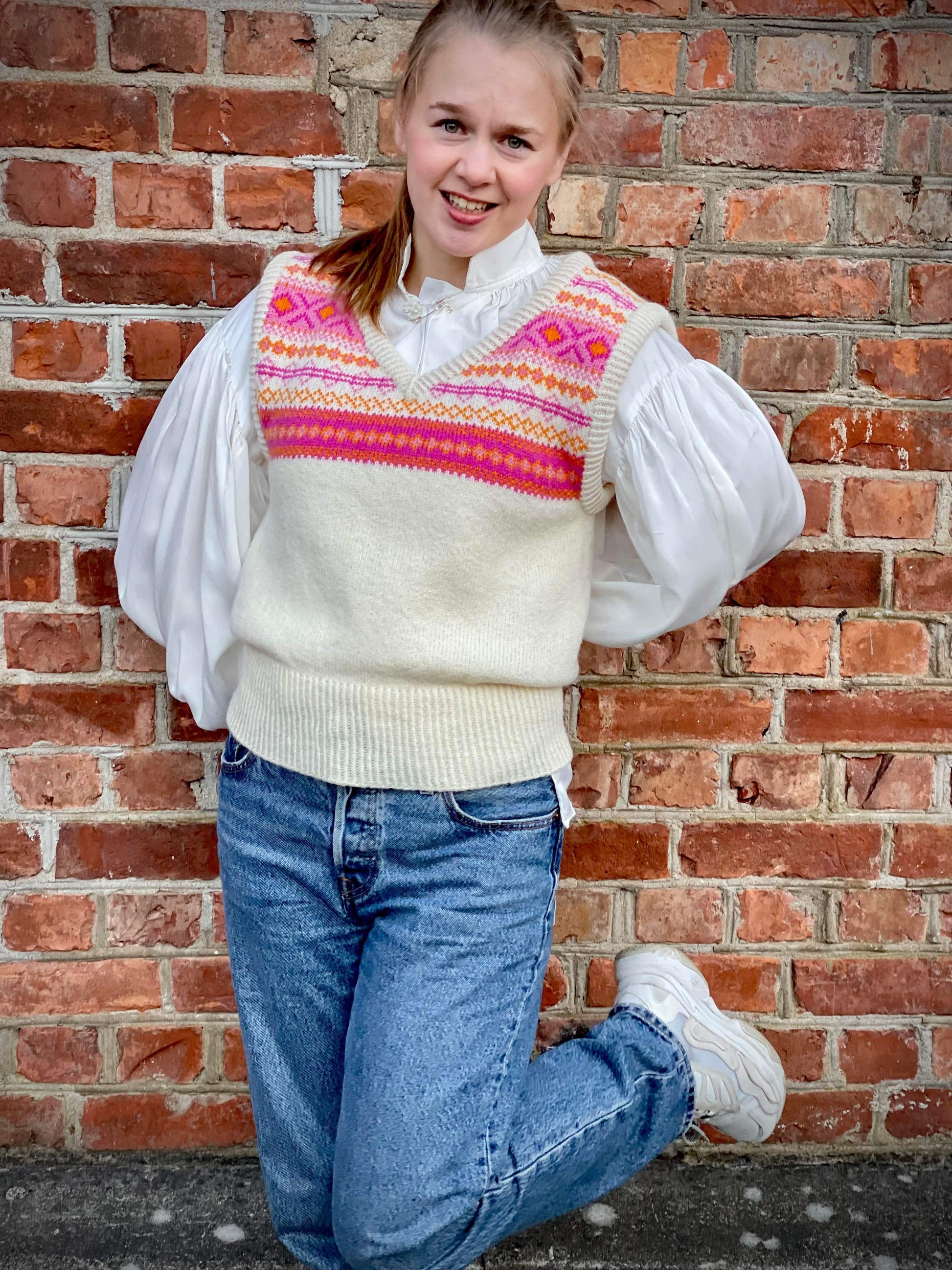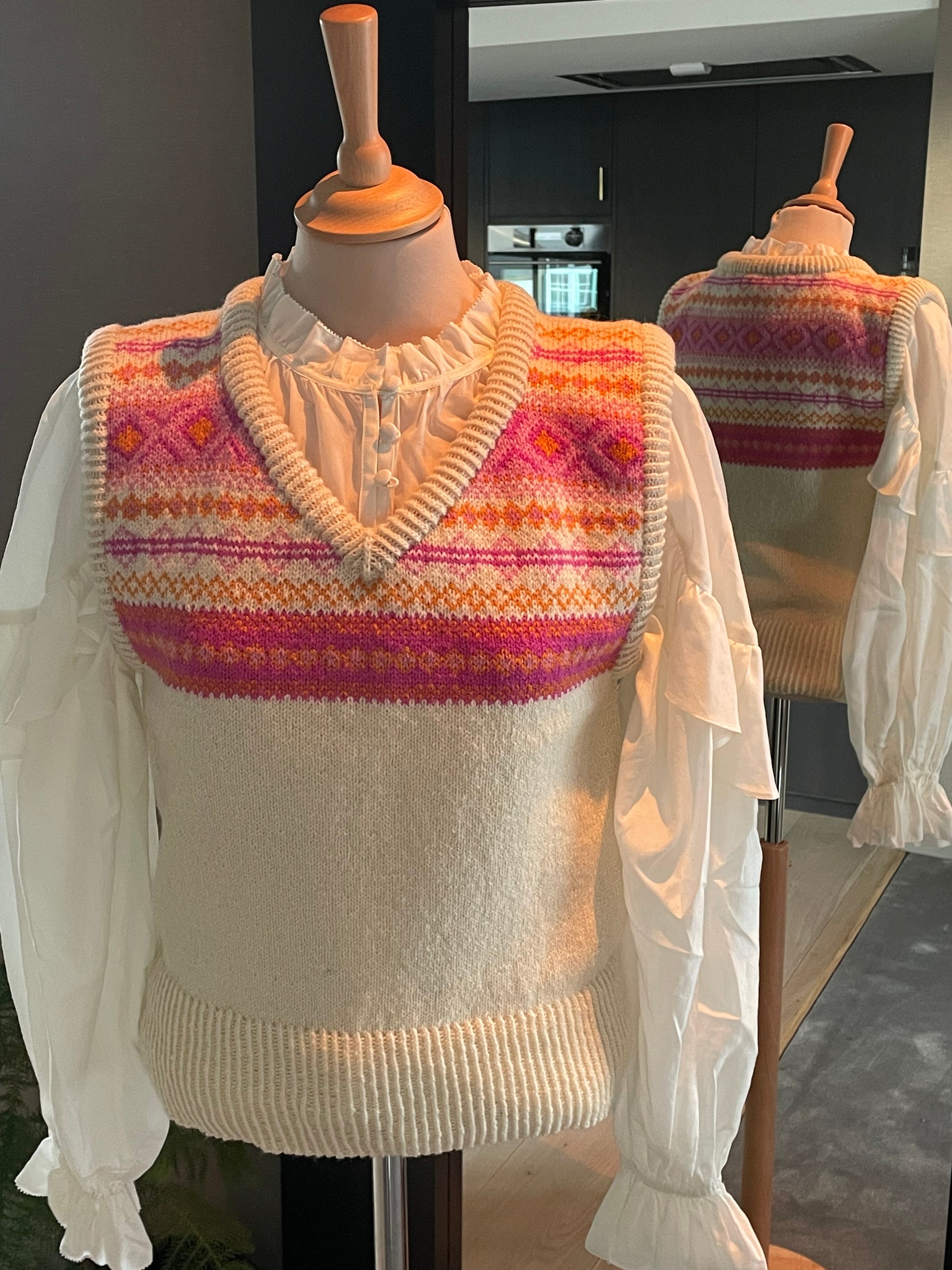 Dette er modell Frøy Vest som er strikket i glade rosa og orange farger. Selges nå til 2000,- + frakt ved forsendelse.